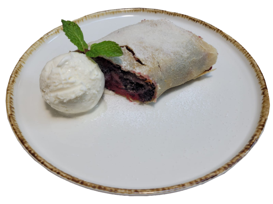 Штрудель с вишней и маковой начинкой с вишнёво-банановым мороженым