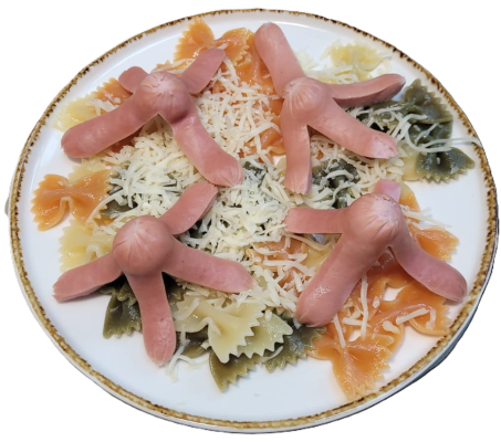 Цветные макарошки с сосиской и сыром